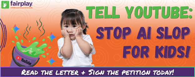 Read the letter and join us in demanding “No AI slop for kids!” by signing Fairplay’s petition today and sharing it with anyone who cares about children’s well-being!