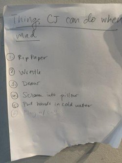 There’s a phrase "under pressure, you don't rise to the occasion, you sink to the level of your training" (often attributed to Navy SEALs or Archilochus). It’s great to keep a reminder of your training that you can refer to when things are falling apart. This is a photograph of our list of go to strategies when my son starts to dysregulate. We can run to the list and ask him what tool he wants to use.